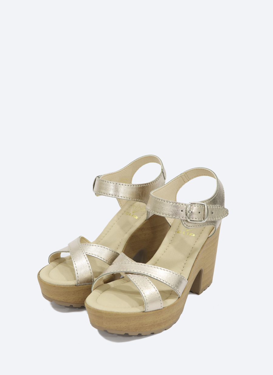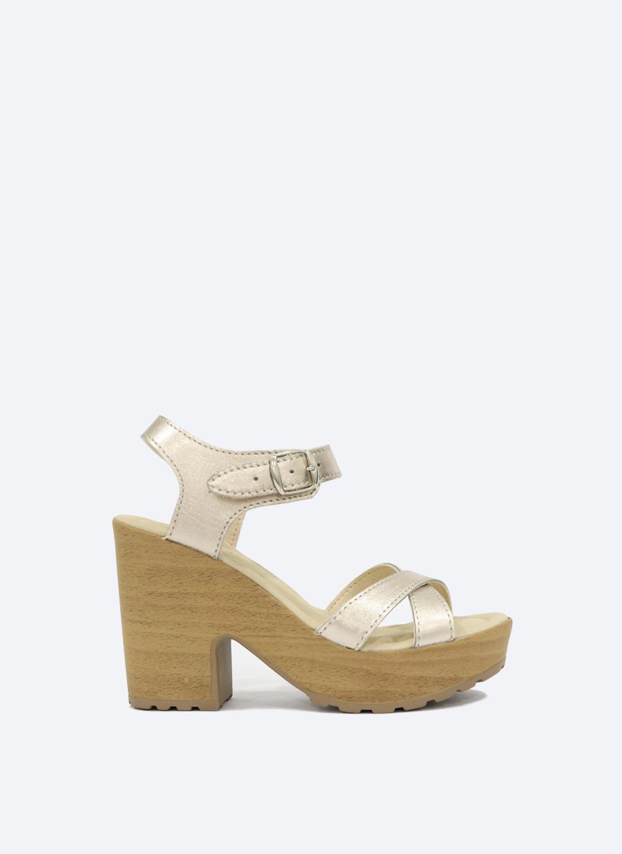 • Sandália de salto alto creme metálico com base em madeira