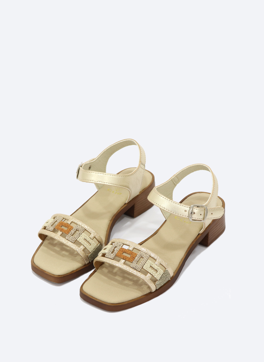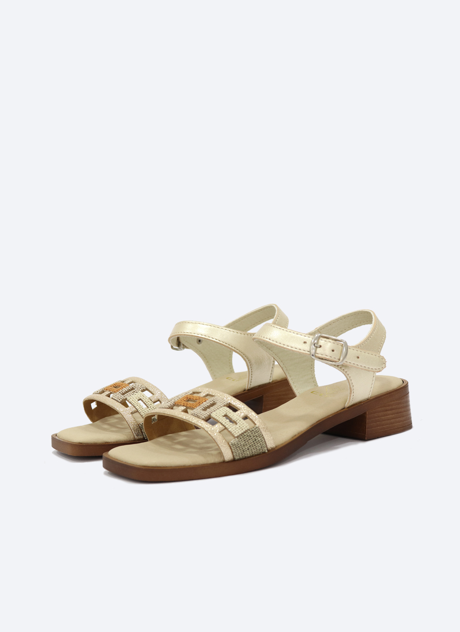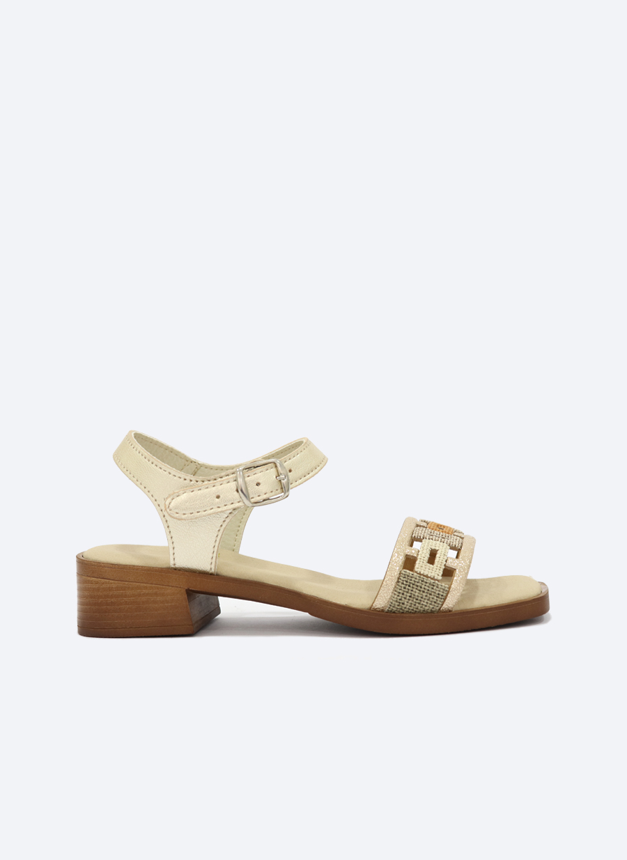 • Sandália bege com salto baixo e fecho de fivela