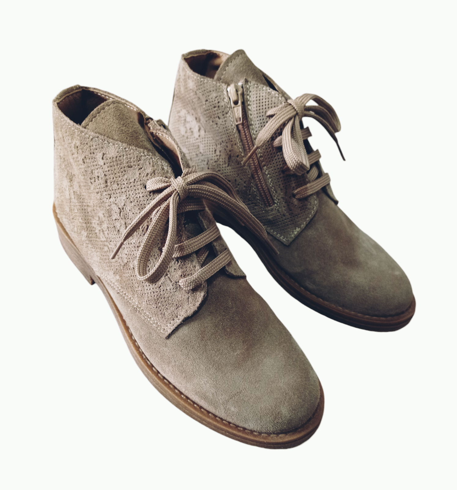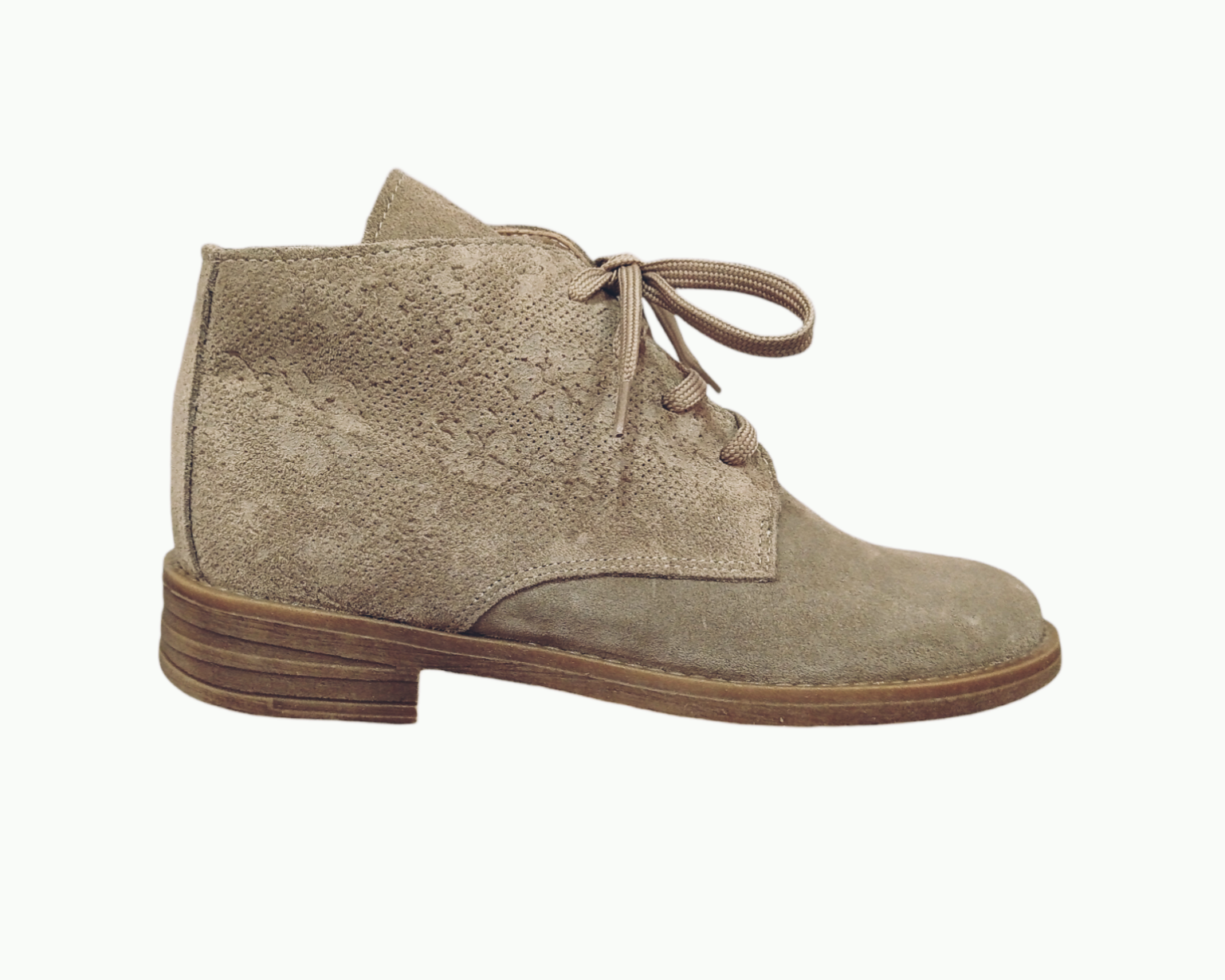 • Bota feminina em camurça castanha com padrão floral e atacadores.