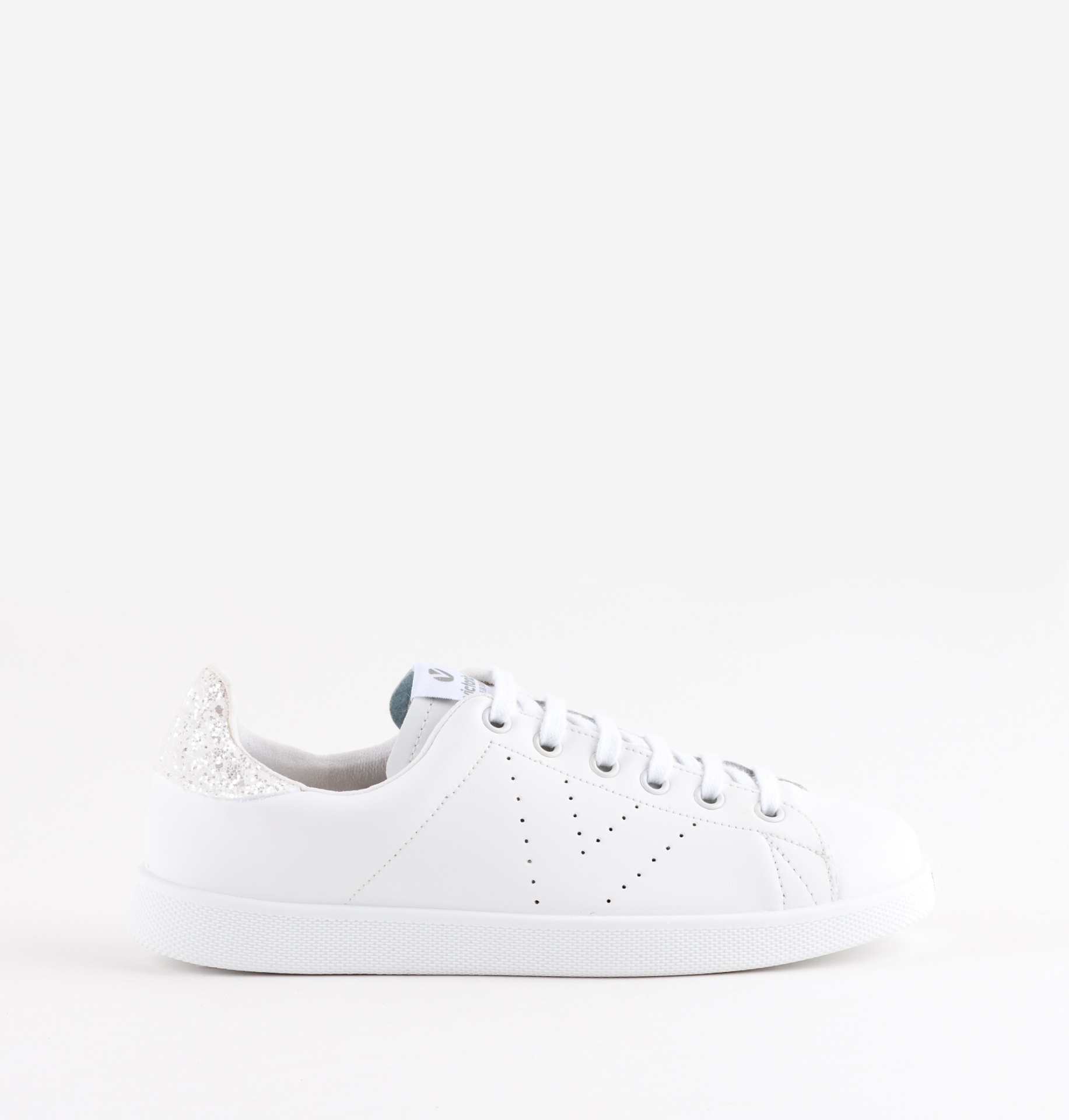 Sapatilhas da marca Victoria. Fabricadas em pele de alta qualidade. Logótipo perfurado na lateral, e peça com glitter no verso. Sola composta por óleos vegetais, reduzindo assim o impacto ambiental.