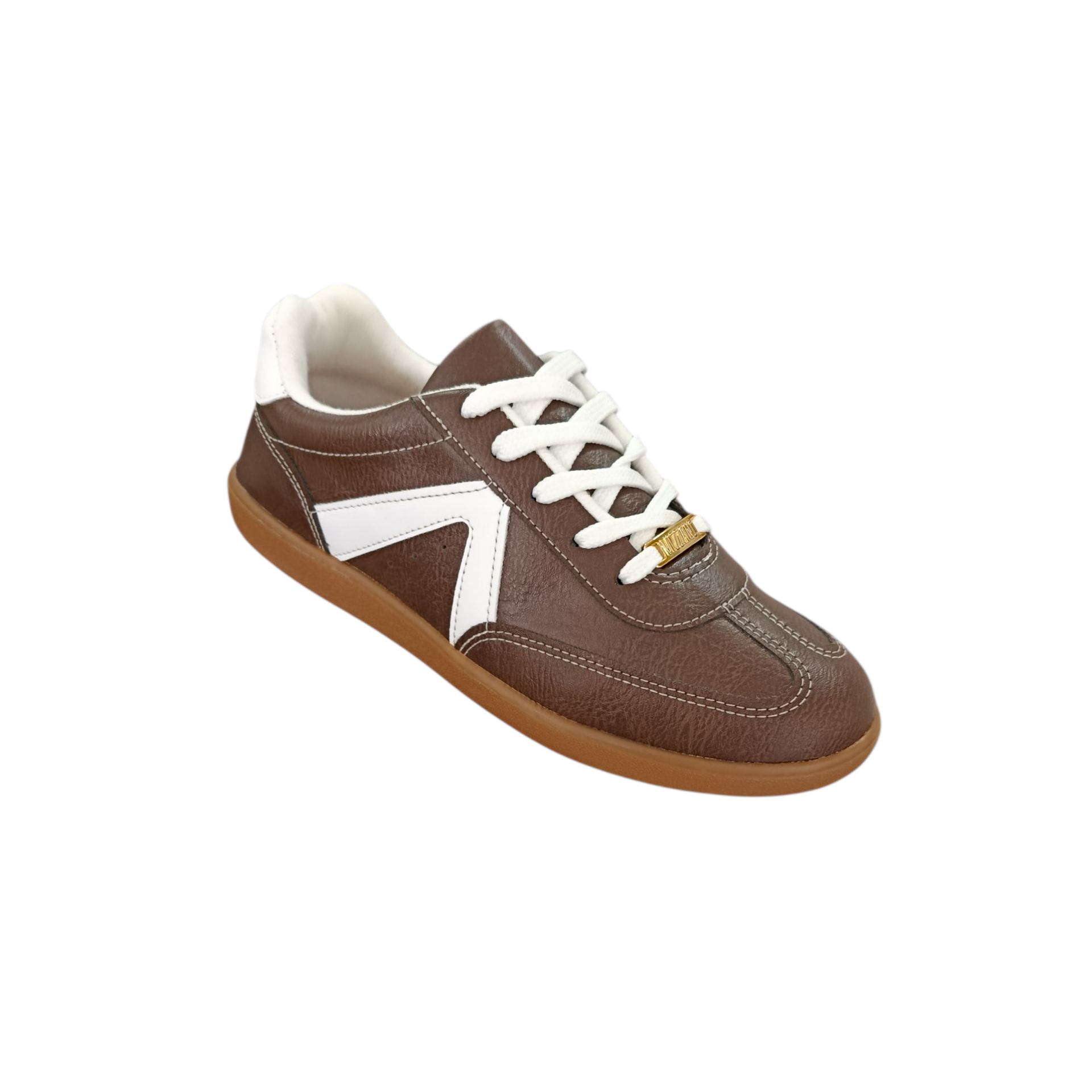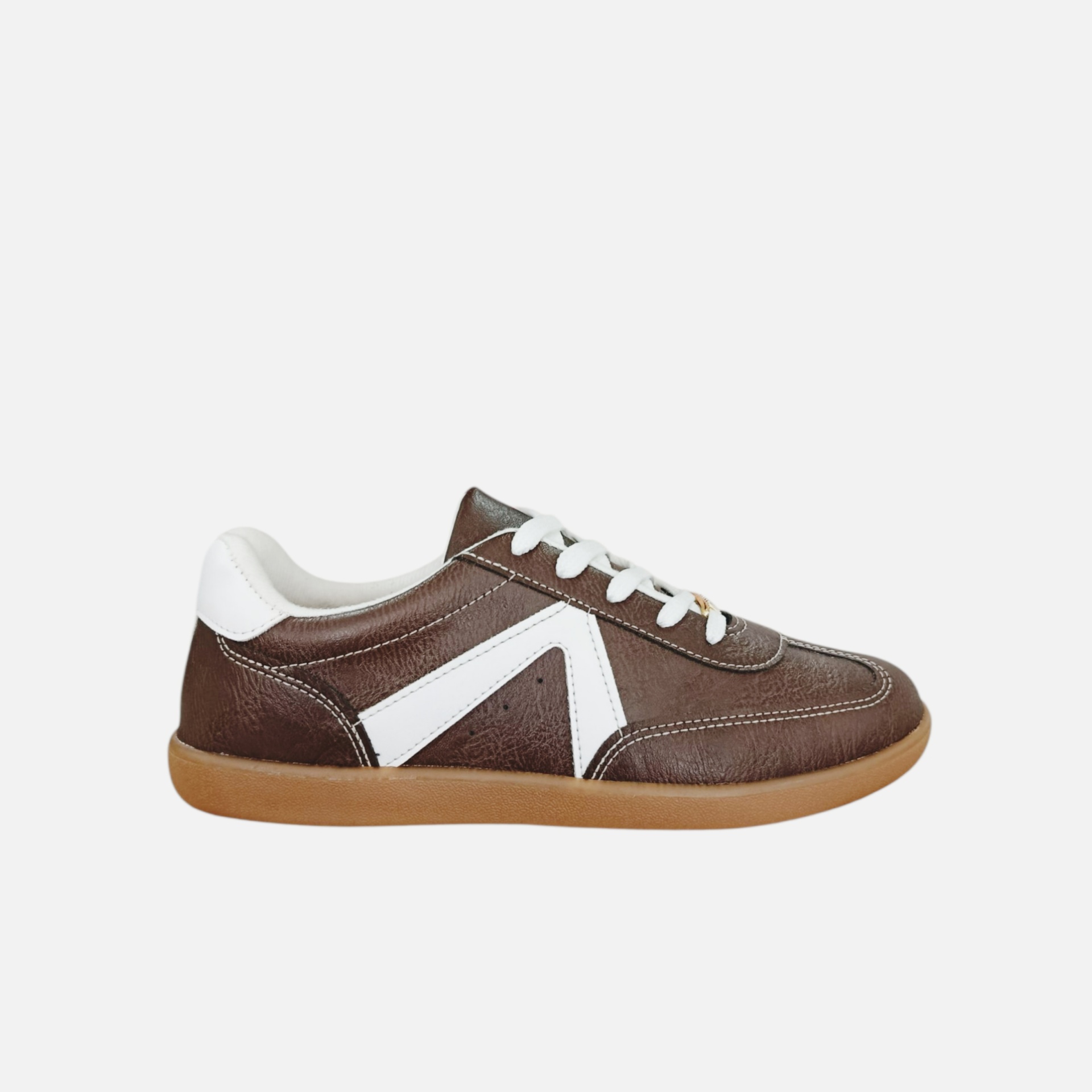 • Ténis castanho com detalhes brancos e sola castanha clara
