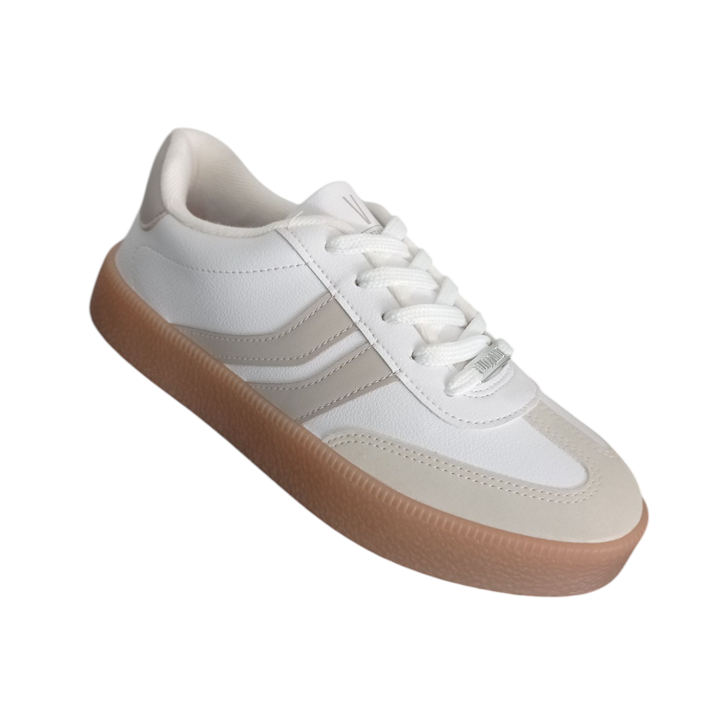 • Ténis branco com riscas cinza e sola castanha clara