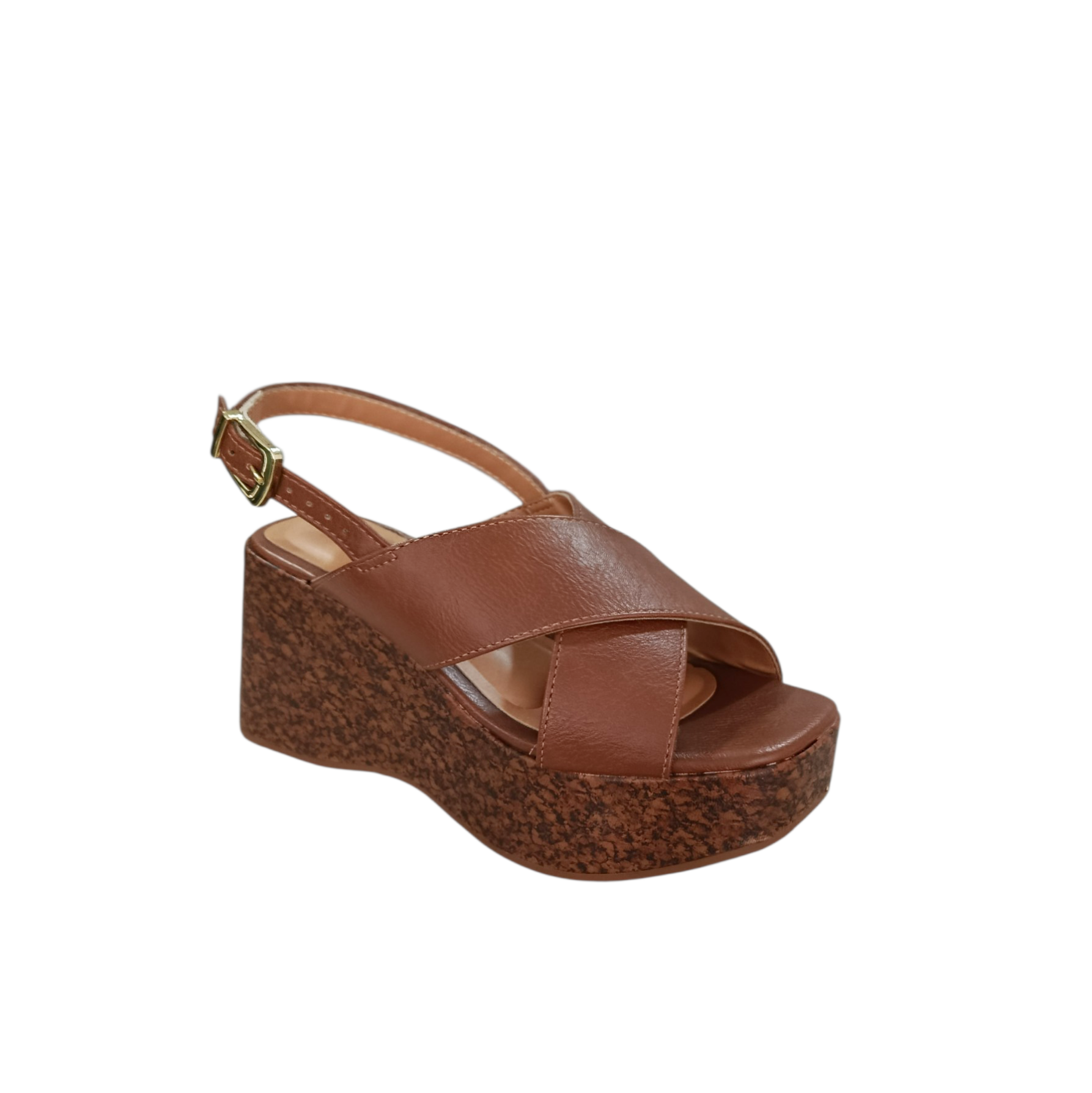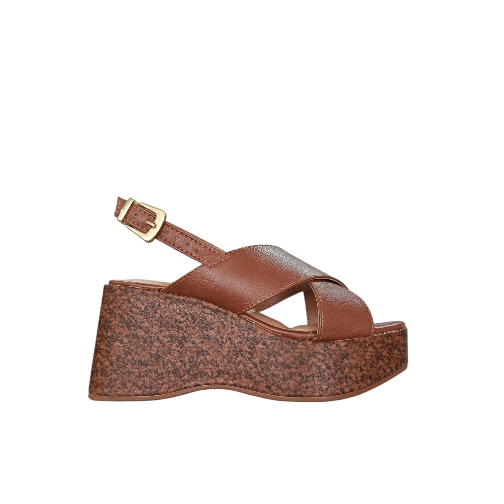 • Sandália plataforma castanha com tiras cruzadas e sola alta moteada.